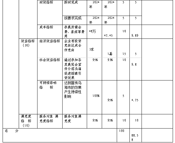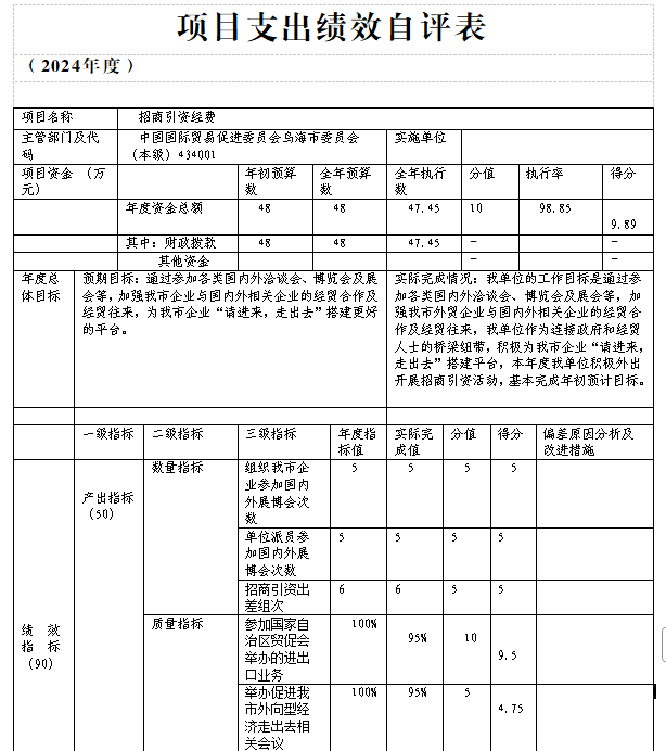 中国国际贸易促进委员会乌海市委员会2024年度在决算中反映1个一般公共预算项目,以及0个政府性基金项目,共1个项目的绩效自评结果。